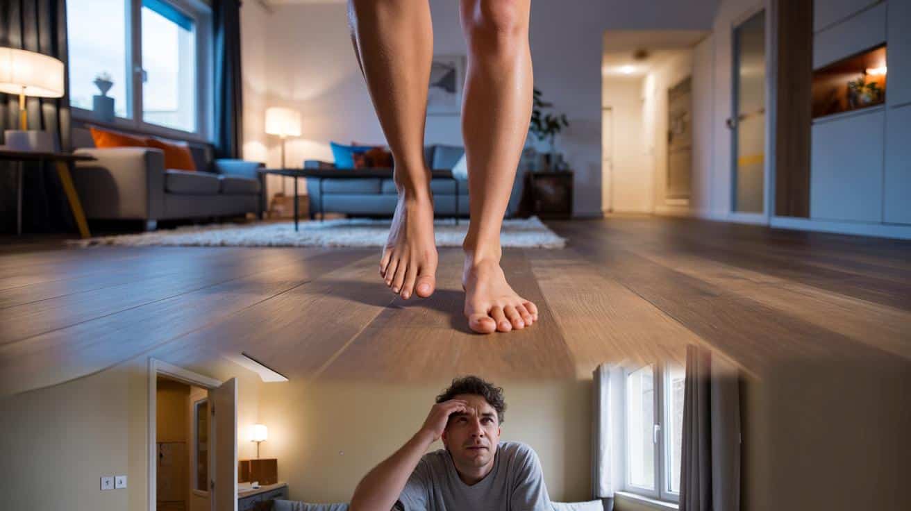 Oben streckt sich jemand, rollt die Fußknöchel, kreist die Zehen, genießt den Kontakt mit dem Boden. Unten reibt sich jemand genervt die Schläfen. Zwei Menschen, ein Haus, völlig unterschiedliche Körpergefühle – und alles entscheidet sich an ein paar nackten Schritten.