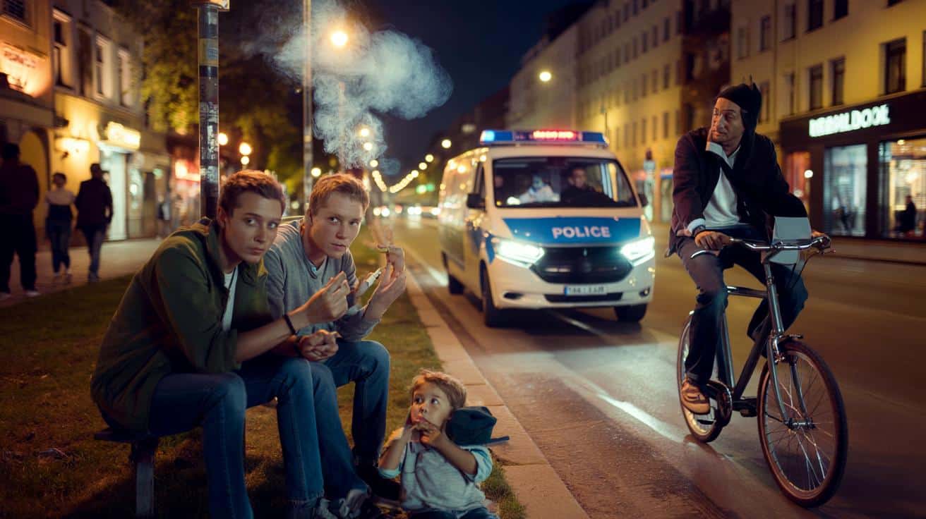Friday night, Kreuzberg. A sweet, skunky cloud is floating over the Landwehrkanal, while a police van crawls past as if it has somewhere better to be. Two students roll a joint on a park bench, half-laughing, half-watching their shoulders. Ten meters away, a dad on a cargo bike plugs his ears as his kid asks loudly, “Papa, why does it smell like that?”