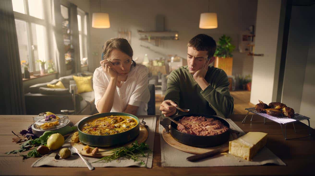 Am langen Holztisch in einer Neuköllner WG stehen zwei Schüsseln nebeneinander: ein dampfendes Linsen-Curry und eine riesige Schale Bolognese mit Rinderhack. Lisa, seit drei Jahren Vegetarierin, schiebt automatisch die Bolognese beiseite, während ihr bester Freund Timo sich eine doppelte Portion auflädt. Keiner sagt etwas, aber die Luft wird dichter. Ein Witz über „Grasfresser“, ein Augenrollen über „Tiermörder“ – und schon ist die Stimmung gekippt.