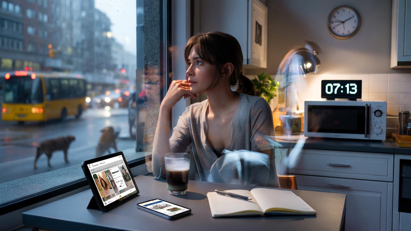 Outside, the city was waking up, buses humming, dogs dragging sleepy humans through the drizzle. Inside, her morning had somehow dissolved between an email, a notification, a half-drunk coffee and a scroll through “just one more” reel.