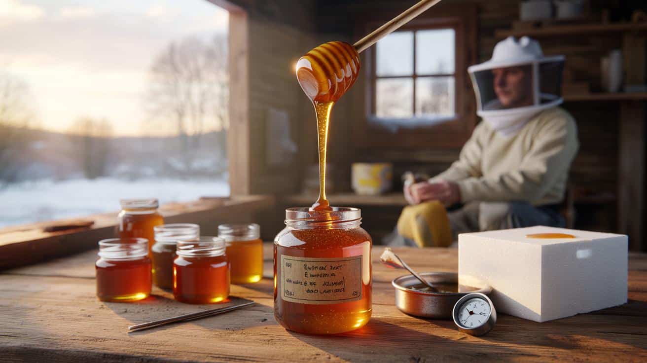 Der Imker dreht das Glas zwischen den Händen wie ein kleines Labor. Ein bernsteinfarbener Faden Honig rinnt heraus, ruhig, klar, ohne den kleinsten Kristall. Draußen ist es Januar, der Boden hart gefroren, der Atem dampft. Drinnen wirkt der Honig, als käme er gerade erst aus einem Sommertag im Juli.