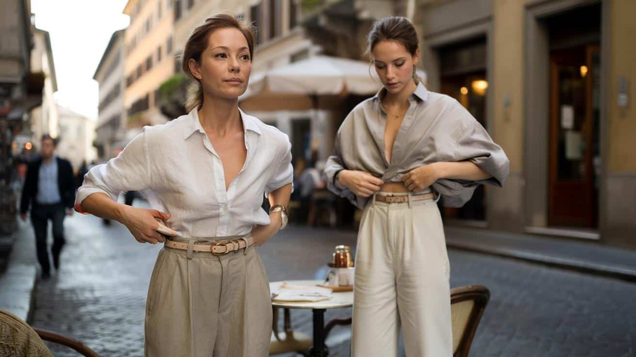 So entsteht dieser typische „italienische“ Look: weich, aber klar, nicht aufdringlich sexy, sondern selbstverständlich. Die Taille wird angedeutet, ohne dass es konstruiert wirkt. Manchmal spannt der Gürtel den Stoff minimal, sodass eine sanfte Falte entsteht, die den Blick lenkt. Diese Kleinigkeit verändert, wie der gesamte Körper wahrgenommen wird – selbst in einem schlichten Jeans-und-T-Shirt-Outfit.