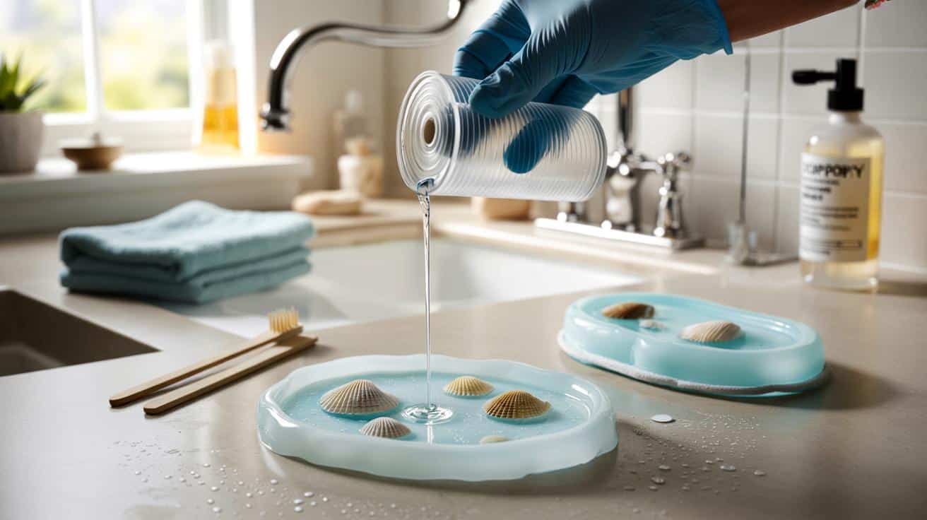 Flüssigkunststoff, oft als Gießharz oder Epoxidharz verkauft, ist im Bad so etwas wie ein kleines Wunder. Er ist glasklar, lässt Muscheln schweben und hält Wasser, Seife und Zahnpastaschaum ohne Murren aus. Das Meer zieht ein, ohne nass zu werden.