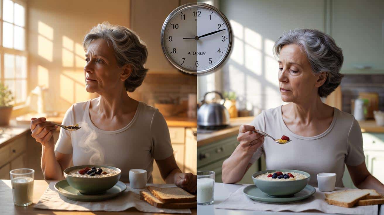 Nach der Menopause verändert sich die Hormonlage. Östrogen sinkt, Schlaf wird störanfälliger, Insulinsensitivität kann abnehmen. Viele Frauen wachen früher auf, essen aber später – etwa durch unregelmäßige Routinen oder einen gedämpften Morgenhunger. Dieses Auseinanderlaufen von Aufstehen und Frühstück vergrößert die Lücke zwischen Lichtuhr und Stoffwechseluhr. Ein früher, kleiner Bissen kann hier stabilisieren.