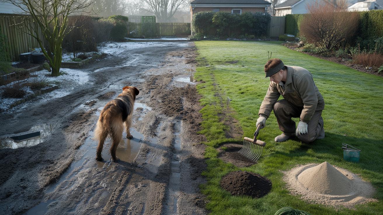 Shaded gardens also suffer more. Without much sun or wind to dry the surface, the wet layer lingers. Add a dog that races across the same route every morning, or children using the lawn as a shortcut, and a muddy strip forms almost automatically.