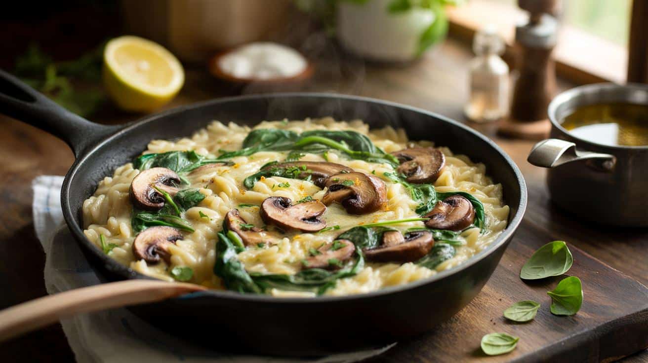 Das Geheimnis eines zart-cremigen Orzo mit Pilzen und frischem Spinat – in 20 Minuten fertig und kein Abwasch!