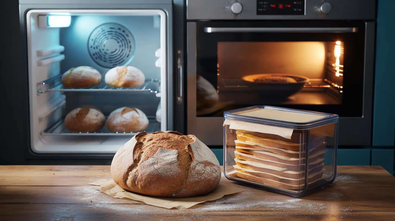 Der Ablauf hat vier Schritte. Erstens: Brot komplett auskühlen lassen, bis die Kruste trocken klingt. Zweitens: 8–10 Minuten bei 110–120 °C in den Ofen legen, Tür leicht geöffnet, damit die Oberfläche sanft nachtrocknet. Drittens: auf ein Gitter legen und unbedeckt im Gefrierfach „anfrieren“ – 60 bis 120 Minuten, je nach Größe. Viertens: in eine feste, wiederverwendbare Box mit Backpapierlagen setzen, Deckel drauf, ab ins Kältefach. Kein Beutel, keine Folie. Zum Essen direkt gefroren auf vorgeheizten Rost bei 220–230 °C für 6–12 Minuten. **Gefrorenes Brot gehört direkt in den heißen Ofen.**