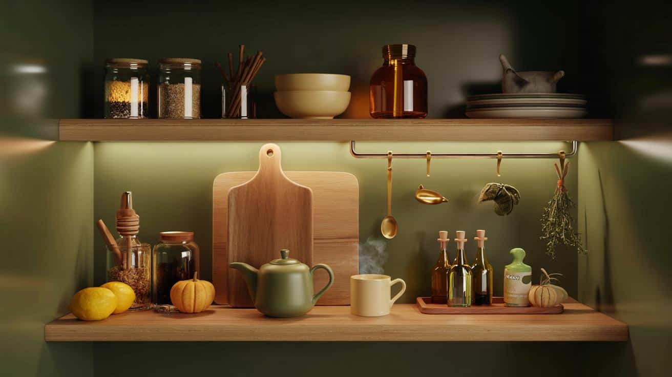 Holz, matte Keramik, dunkles Glas – mehr braucht es nicht, um aus Regalbrettern eine warme Herbstkulisse zu machen. Stellen Sie ein großes Schneidebrett nach hinten, davor zwei stapelbare Müslischalen, daneben ein bernsteinfarbenes Vorratsglas mit Tee. Kleine Herbst-Texturen wirken wie ein Wärmeschalter. Der Trick: Ähnliche Töne gruppieren, Kontraste sparsam setzen, Metall nur als Akzent (Messinglöffel, Haken). So entsteht Tiefe, ohne dass es nach Ladenregal aussieht.