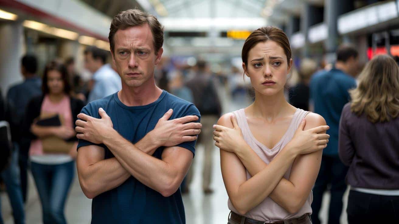 Schultern leicht hochgezogen, Blick nach unten, die Arme fest vor der Brust verschränkt. Gegenüber steht eine junge Frau, gleiche Haltung, Kopfhörer im Ohr, Stirn in Falten. Zwei Menschen, die auf den ersten Blick wirken, als wollten sie die Welt auf Abstand halten. Niemand spricht sie an, niemand lächelt. Jeder sieht nur die verschränkten Arme – und liest darin Ablehnung. Vielleicht sogar Arroganz. Was man nicht sieht: den stressigen Tag, die innere Unruhe, das leise Bedürfnis, sich irgendwie zu halten, wenn alles außen wackelt. Körpersprache erzählt Geschichten. Wir verwechseln sie nur oft.