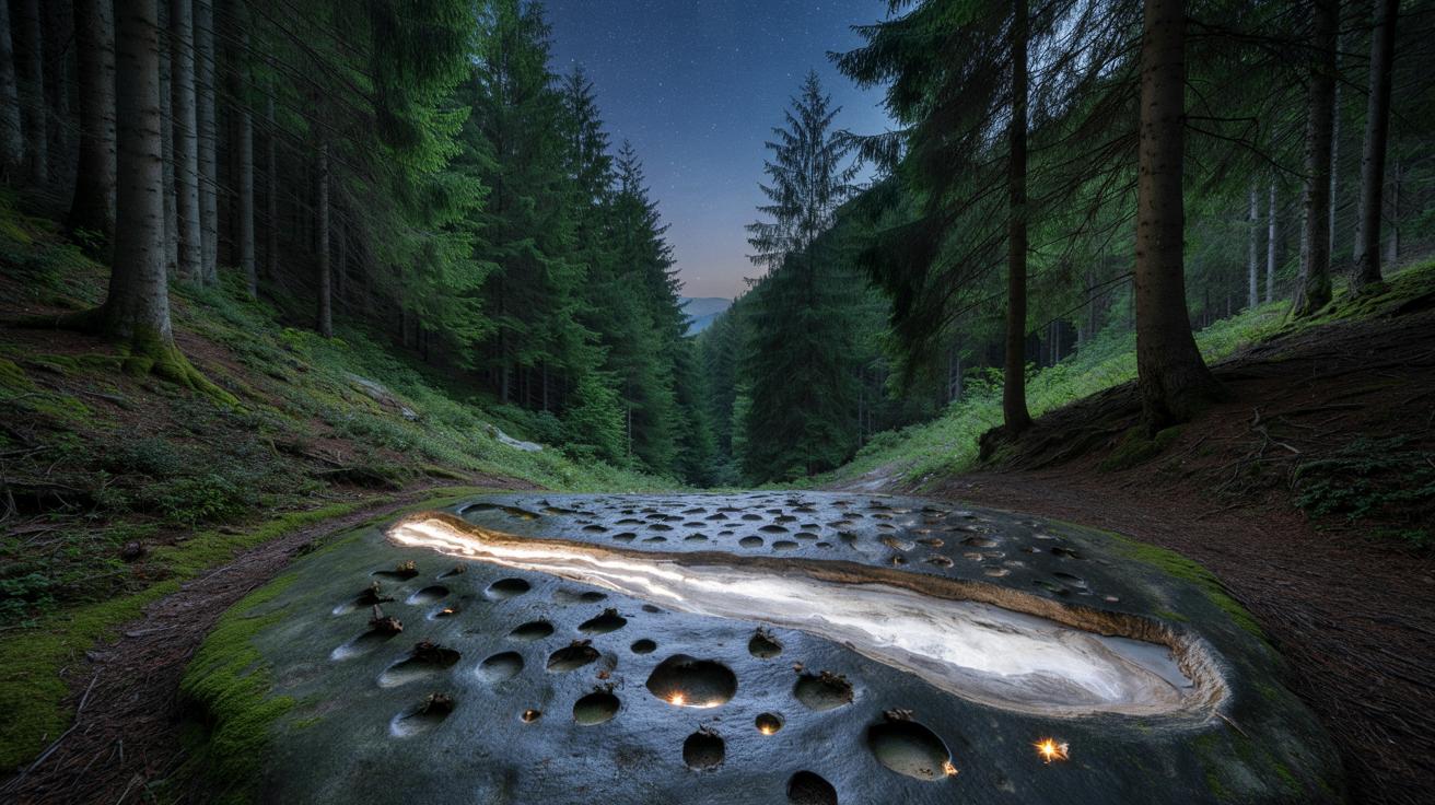 56 exakt eingearbeitete Vertiefungen, ein heller Streifen wie eine Milchstraße – und ein Wald, der all das fast verschluckt hat.