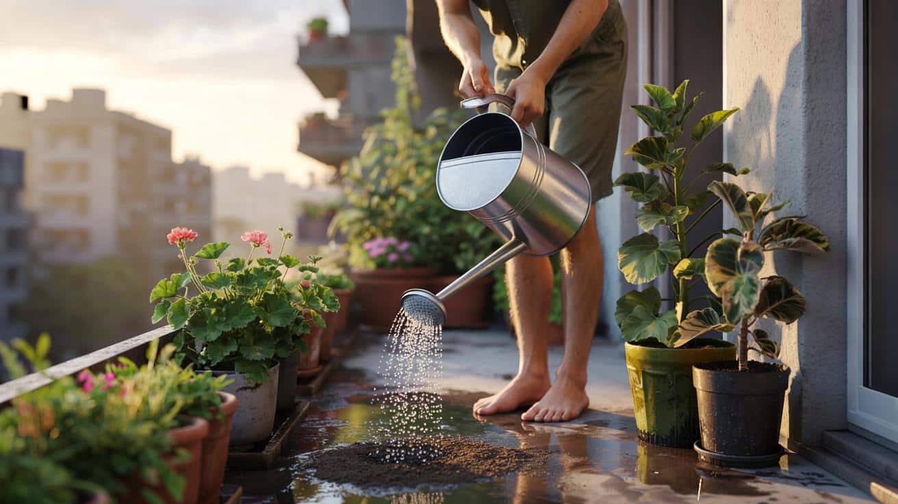 Ein kleines Bild aus einem typischen Innenhof: Zwei Nachbarn, zwei Gießgewohnheiten, ein schmaler Balkon mit Geranien. Links wird konsequent morgens gegossen, meist gegen sieben, bevor es ins Büro geht. Rechts gibt es die „nach Feierabend“-Routine, oft gegen 20 oder 21 Uhr, wenn die Sonne schon weg ist.