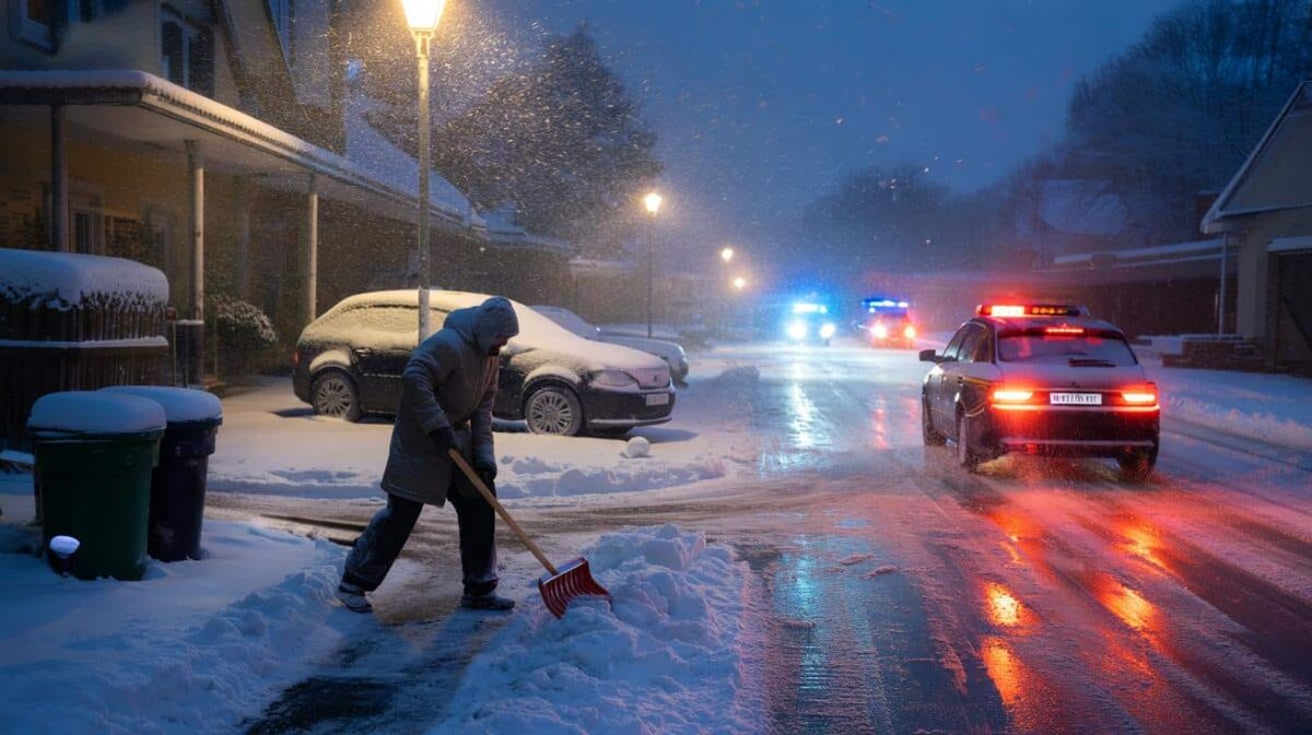 Jemand aus der Nachbarschaft kämpft sich mit einem Schneeschieber durch eine frisch gefallene, dicke Schicht Weiß, die seit der Nacht alles zudeckt: Autos, Mülltonnen, sogar die Bordsteine. Die Straßenlaternen werfen ein gelbliches Licht auf tanzende Flocken, die immer dichter werden, beinahe aggressiv. In der Ferne heult eine Sirene, ein Auto rutscht beim Anfahren leicht zur
