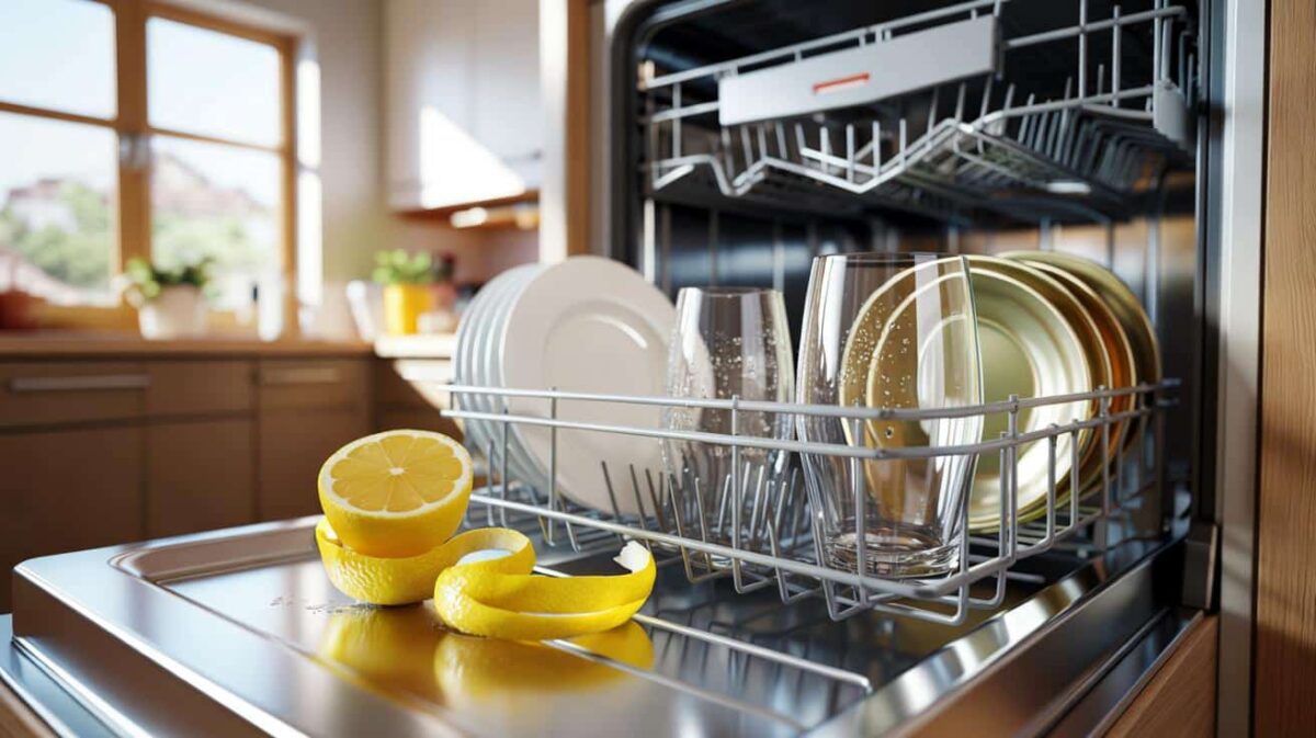 Wenn Sie Zitronenschalen in die Spülmaschine geben, erhalten Sie einen frischen Duft und glänzende Gläser ganz ohne Klarspüler